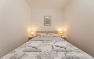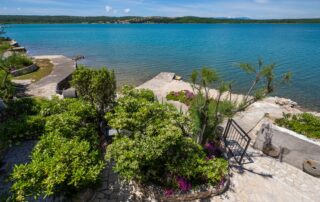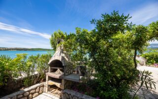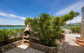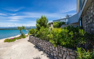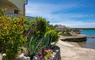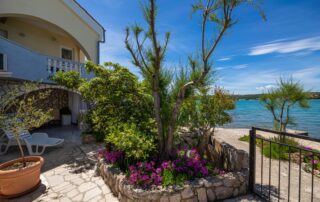 Our house is surrounded on three sides by the sea, which enables sea view from all the rooms. Around it are many Mediterranean plants like oleander, olives, palm trees, cacti, tamarix and diverse flowers which every year we try to further enrich. The apartments are located on the ground floor of a two story dwelling, each have a separate terrace with access to the sea, outdoor showers and a grill. Especially interesting information for our guest is that a small pebble beach with a small boardwalk is right outside our front gate. If you arrive by car, the small apartment (studio apartment 1/2+1) has its own parking place at the rear of the house, while the big apartment (apartment 1/4+1) parking is located at the front.